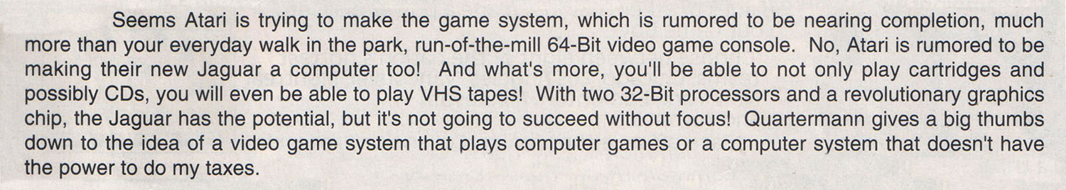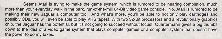 Quartermann exemplifies the soft bigotry of console lovers. In his mind, computers are for word processing and calculating taxes, not video games and fun. When he hears that Atari's Jaguar may be a multimedia system, his instinct is to give it a "big thumbs down." He doesn't want to own a video game system that plays computer titles. He must really hate the state of today's games industry.