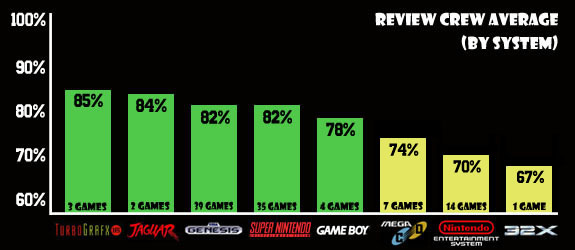 On the subject of numbers, we decided to go an extra step and break down the averages by system. Of the 105 games reviewed, the Genesis and Super NES starred in the most amount of episodes, with 39 and 35 respectively. Fanboys looking for a decisive victory will have to wait, because both systems are tied at 82%. The top ranked systems were the TurboGrafx-16 (85%) and Atari Jaguar (84%), but these high averages are likely due to only reviewing two or three games. The same is true for the worst reviewed system, Sega's 32X.