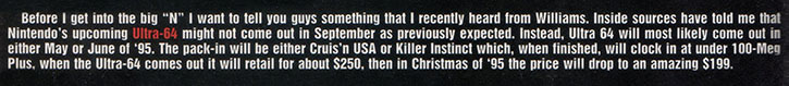 Only three years after the launch of the Super NES, Die Hard Game Fan couldn't wait to talk about Nintendo's 64-bit super system. Then known as the Ultra 64, the Game Fan editors predicted that the system would come with either Killer Instinct or Cruis'n USA as a pack-in and launch for $250. And as if that's not specific enough, the system's price would drop to an "amazing" $199 during Christmas 1995.