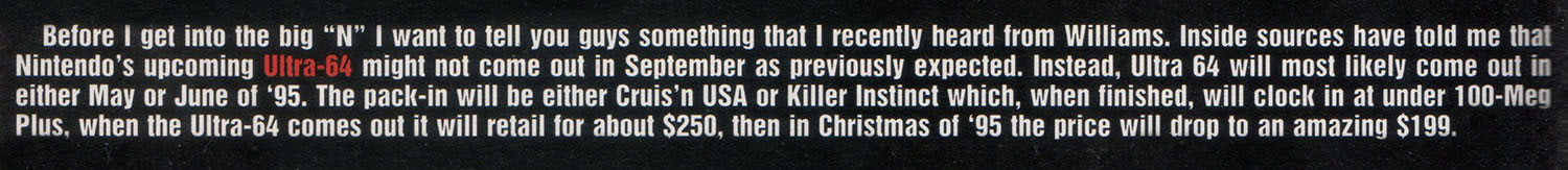 In reality, the Nintendo 64 launched in September of 1996, not "May or June '95" as predicted. Neither Killer Instinct nor Cruis'n USA came with the system, as Nintendo bucked the trend and shipped the system without a pack-in. What's more, neither of those games even made the N64's launch, with Killer Instinct Gold dropping in November and Cruis'n USA lagging behind in December.