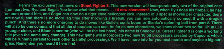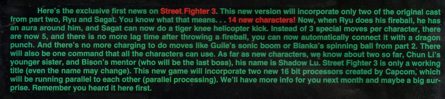 Believe it or not, the Street Fighter III rumors kicked off in Die Hard Game Fan's April 1993 issue, when they revealed that Ryu and Sagat would be the only returning characters. The magazine was so sure of this information that they reported on Sagat's tiger knee helicopter kick.