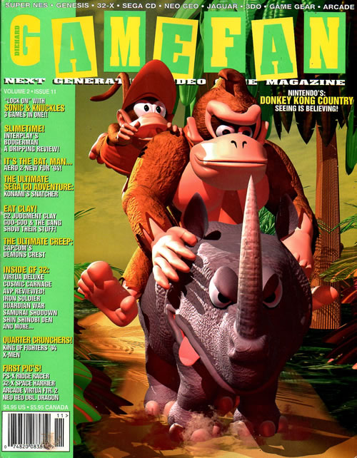 "When you see Donkey Kong Country for the first time, you'll do what I did ... turn into a blabbering, drooling idiot! This is the most amazing 16-bit game yet, and that's a fact. Simply everything about DKC is kick-butt rocking magnificent ... you'd swear it was 32-bit. If you possess a SNES, you have no excuse not to buy this game NOW." -Mr. Goo