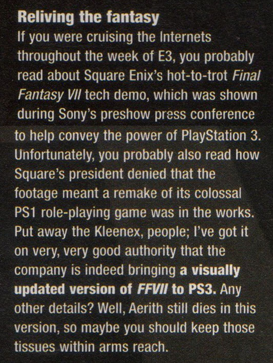 To be fair to Electronic Gaming Monthly and the countless other magazines that ran similar predictions, this rumor was bound to happen sooner or later. Not only is it one of Square's most iconic games, but this is a company that has made a lot of money on remaking Final Fantasy games. And no matter how many times the developers came out and said it wasn't happening, we all knew deep down in our guts that it would eventually become reality.