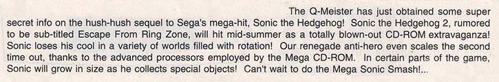 This rumor comes from the December 1991 issue of Electronic Gaming Monthly, mere months after Sega debuted their newest mascot. Sonic the Hedgehog was not only winning over critics, but also convincing gamers to buy the Genesis instead of Nintendo's competing 16-bitter. Obviously a sequel was planned, but Sonic the Hedgehog 2 turned out to be nothing like Quartermann described.