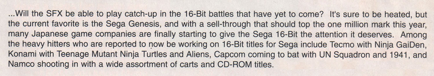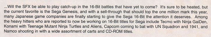 Here we see the so-called gossip guru worried that the Super NES might not catch up to Sega's two year head start. Thanks to brisk sales, Quartermann predicted that some of Japan's biggest third-party publishers would jump ship and support the Genesis and Sega CD. He predicted Tecmo, Konami and Capcom would port games like Ninja Gaiden, Teenage Mutant Ninja Turtles, Aliens, UN Squadron and 1941. This was a great list of games on a system that had built its reputation on high-quality arcade ports.