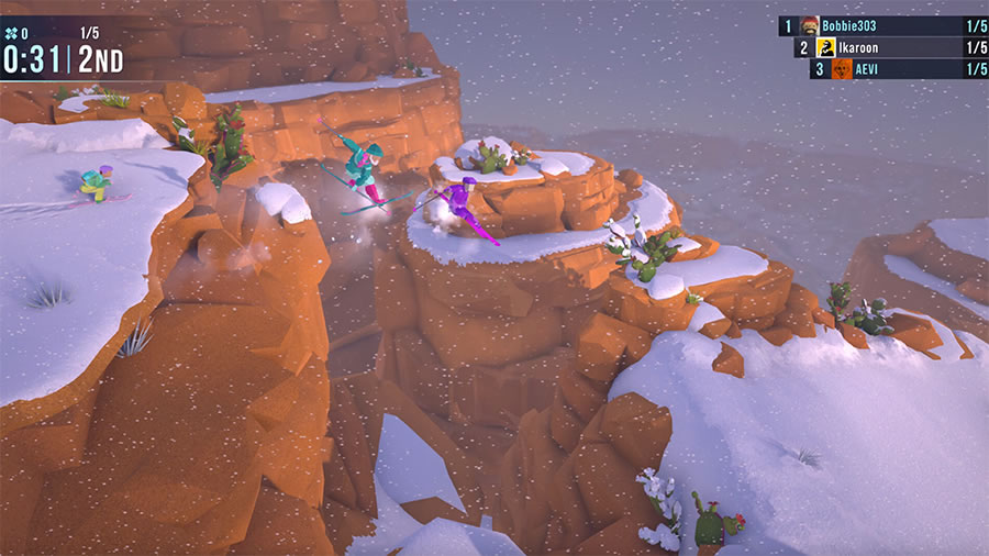 By switching from dirt bikes to skiing, the developers have managed to open up the levels and really expand on the original concept. One of the biggest issues I had with the original game was its use of narrow paths that sometimes felt a bit claustrophobic. While there are definitely narrow moments in Snow Riders, the levels are far more open, giving you a lot more options on how you want to complete each event.