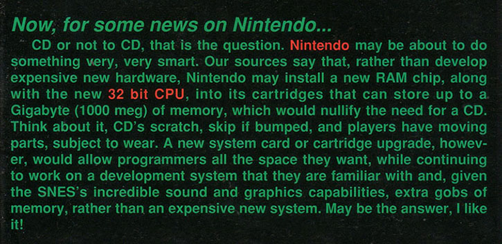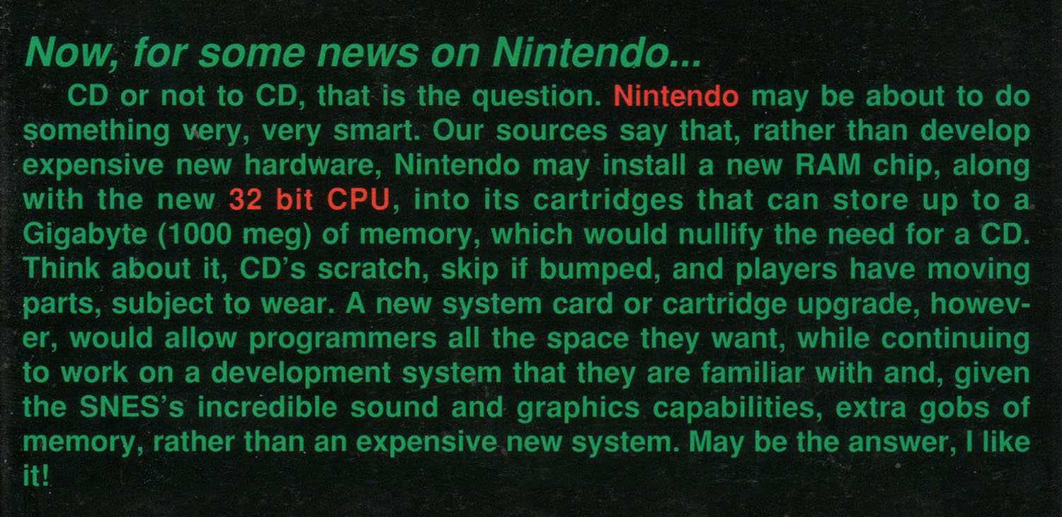 Two years after announcing the existence of the Super NES CD, Nintendo had yet to set any concrete release plans. This led many in the press to wonder if Nintendo had scrapped the device entirely, instead choosing to focus their attention on the inevitable next-generation console. Unsure how to cover the story, Die Hard Game Fan decided to just make a bunch of stuff up. The result is a 32-bit cartridge loaded with a gigabyte of inexpensive memory.