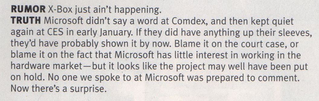 While I'm in a generous mood, I might as well also let Quartermann off the hook. Technically, he's right; Microsoft opted against unveiling the system at 2000 Comdex and CES. Instead, they chose to send The Rock on stage to officially unveil the Xbox one year later, on January 3, 2001. The system was released later that year and went on to sell 25 million units. While that's nowhere near the PlayStation 2's 155 million, it's also not bad for a system reportedly canceled due to losing an antitrust case.