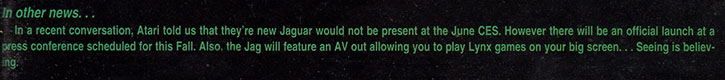 Talk about burying the lead. Forget the stuff about Atari missing the Summer Consumer Electronics Show, what's this about Lynx games working on the Jaguar? And that's because of an AV out? Okay, this needs a little unpacking.