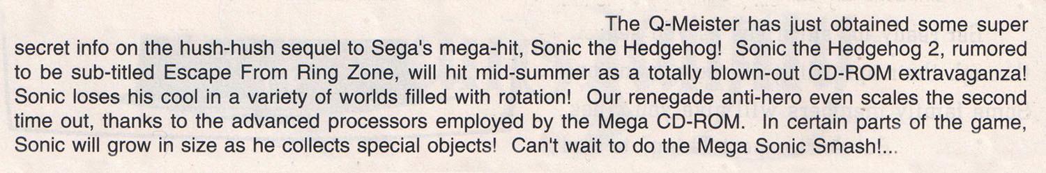This rumor comes from the December 1991 issue of Electronic Gaming Monthly, mere months after Sega debuted their newest mascot. Sonic the Hedgehog was not only winning over critics, but also convincing gamers to buy the Genesis instead of Nintendo's competing 16-bitter. Obviously a sequel was planned, but Sonic the Hedgehog 2 turned out to be nothing like Quartermann described.