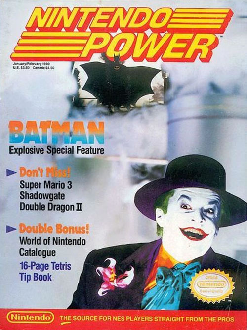 In their first issue of the 1990s, Nintendo Power decided to feature the biggest movie of ... 1989? It's true. This cover features characters from Tim Burton's Batman, the comic book film that took theaters by storm in June of 1989. But before we pile the Nintendo Power design team, it turns out that this isn't a repeat of the infamous Track & Field II cover. You can put down your pitchforks and torches, because this January/February issue is here to introduce the world to the just-released Batman video game for the Nintendo Entertainment System.
